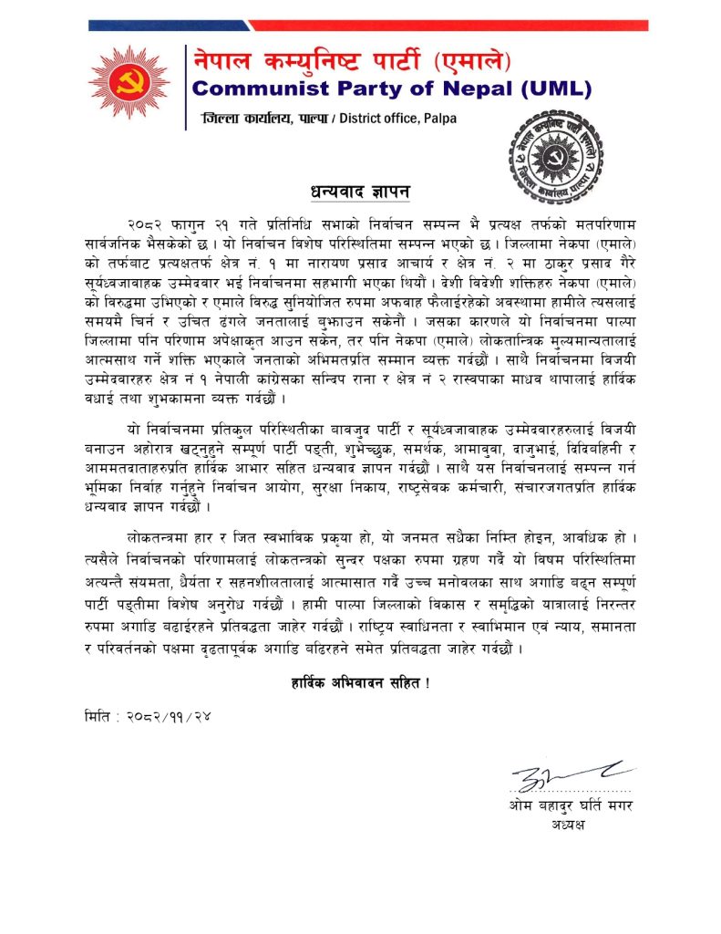 प्रतिकूलताका बावजुद पार्टी र सूर्यध्वजावाहक उम्मेदवारका पक्षमा अहोरात्र खट्ने सम्पूर्ण कार्यकर्ता, शुभेच्छुक र मतदाताप्रति एमालेले आभार प्रकट गरेको छ । साथै, निर्वाचन सम्पन्न गराउन भूमिका खेल्ने निर्वाचन आयोग, सुरक्षा निकाय, राष्ट्रसेवक कर्मचारी र सञ्चार जगतलाई पनि धन्यवाद ज्ञापन गरिएको छ । एमालेले आगामी दिनमा पनि पाल्पाको विकास, समृद्धि, राष्ट्रिय स्वाधीनता र न्यायको पक्षमा आफ्नो यात्रा निरन्तर जारी राख्ने प्रतिबद्धतासमेत जनाएको छ ।