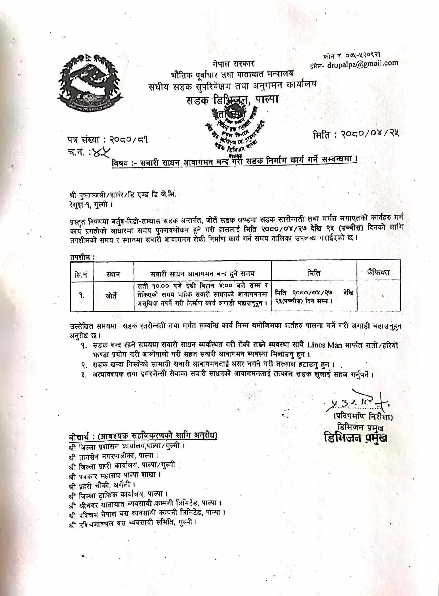 तानसेन रिडी सडकखण्ड २५ दिन अबरुद्ध
